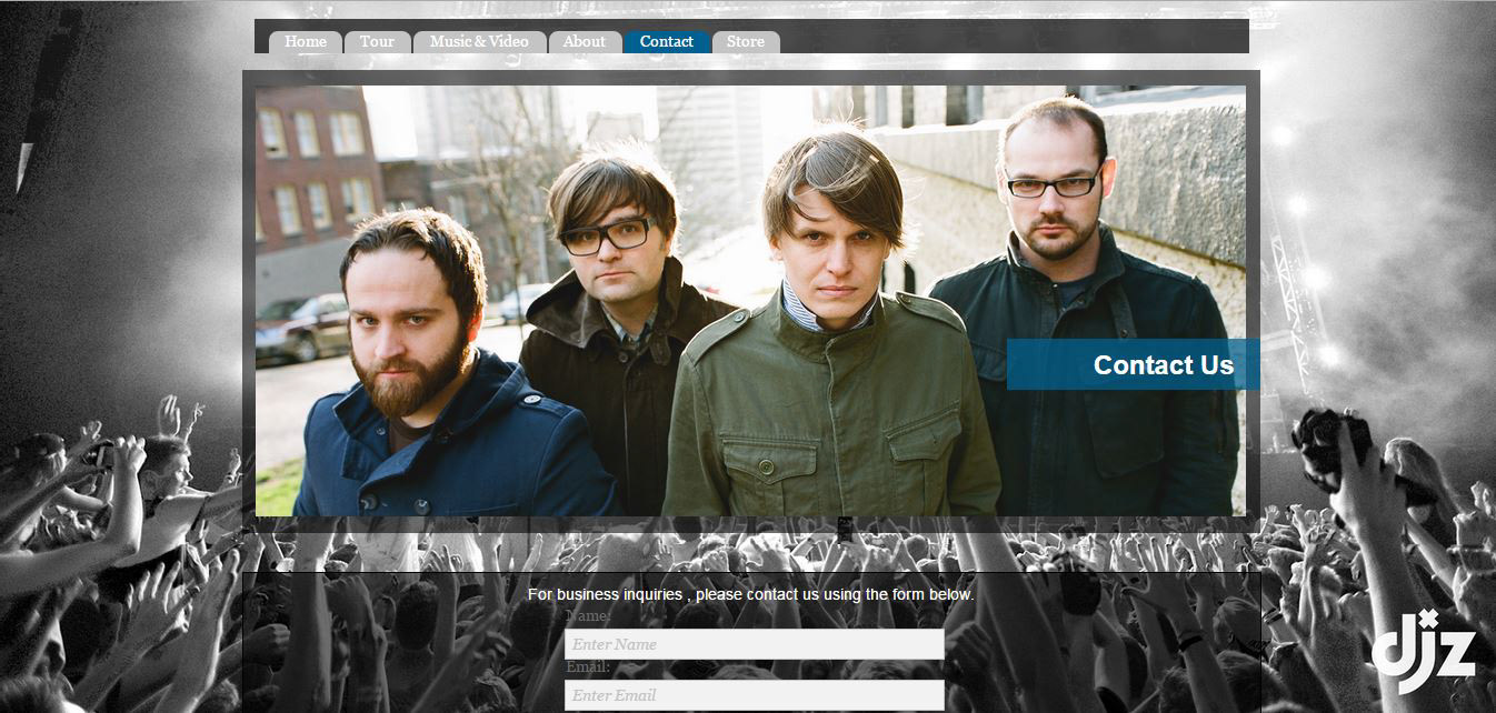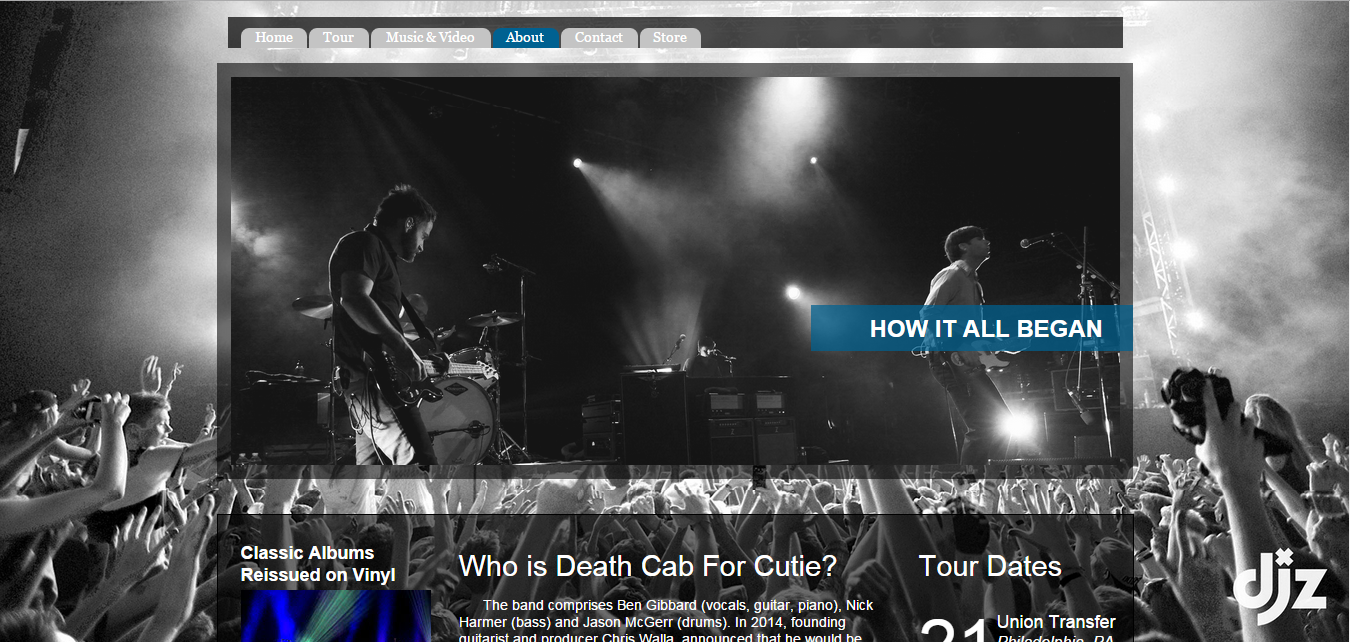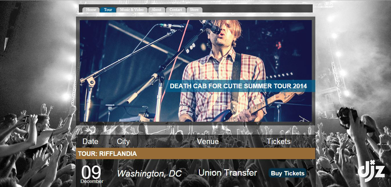 This is my final project for my Web Design class where I created a functioning website using Adobe Muse. There are six pages, Home, Tour, Music, About, Contact, and Shop.